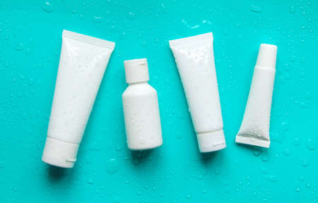 Empty tubes for the design of cosmetics on the blue background. Female cosmetics. Tubes for cream, liquids, pastes and gel.