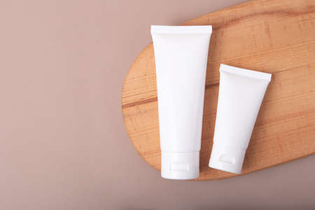 Top view of blank cosmetic tubes on wooden slice.Earth tones,eco friendly concept.