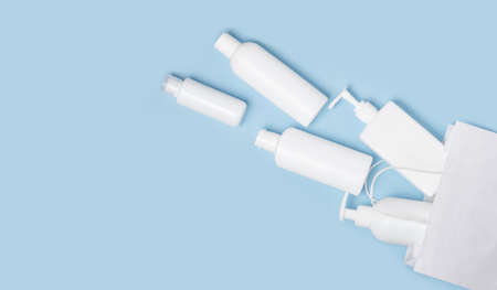 White cosmetic jars are in the shopping bag on a blue background. Purchase of cosmetics and hygiene products, home shopping.