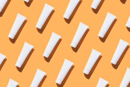 Pattern made with white tubes of sunscreen cream, hand cream or body lotion over orange background. Flat lay style, mockup image