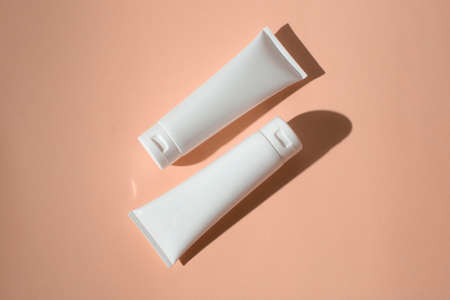 White cream tubes on light orange table. Care about face, hands, legs and body skin. Women beauty products. Cosmetic regular pattern. Empty place for logo on bottles. Hard light directly above flat lay