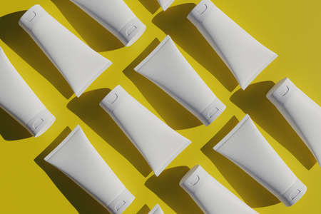 White cosmetic tubes on yellow background. template for cosmetics, minimal style 3d rendering.