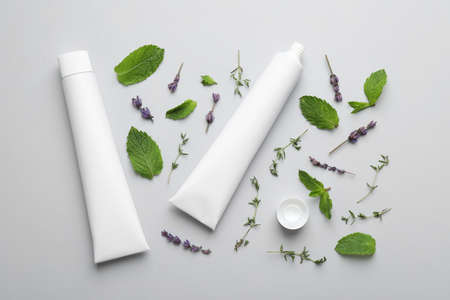 Blank tubes of toothpaste, mint, thyme and lavender flowers on white background, flat lay