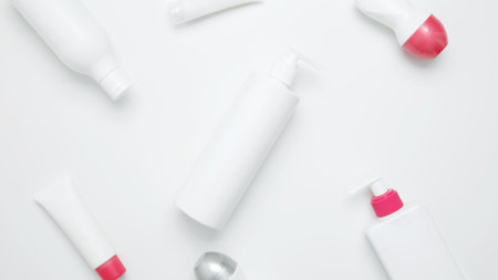 Cosmetic beauty products on white background. Bottles and tubes with branding mock up. Skin care and beauty concept. Top view, flat lay, copy space, frame banner