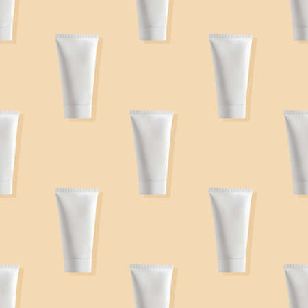 Seamless pattern of mockups of white plastic tubes for cosmetics. Containers for face and hand cream, moisturizing lotion, cleanser, shampoo on beige background with shadow. flat lay.