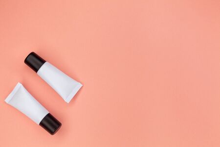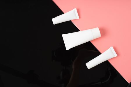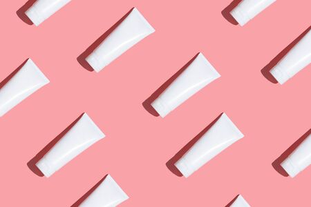 White cream tubes on light pink table. Care about face, hands, legs and body skin. Women beauty products. Cosmetic pattern. Empty place for logo on bottles. Hard light directly above flat lay