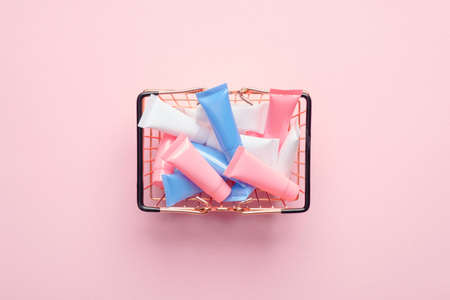 Shopping basket full of cosmetics products on pink background. Flat lay, top view. Beauty store sale, discount concept.