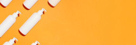 Banner with white pump bottle pattern on orange background. Dispenser bottle with soap, shampoo, antibacterial sanitizer mock up. Flat lay copy space