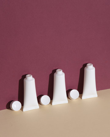 White cream tubes on burgundy beige background with shadow. Creative beauty layout. Mockup, template for design