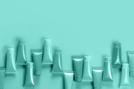 Blank white tubes of ointment on light green background, flat lay. Space for text