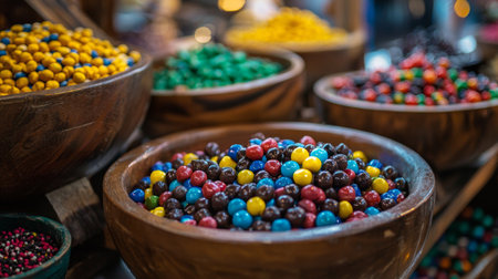 An assortment of colorful candies in wooden bowls, displayed at a market stall, evoking a sense of fun, nostalgia, and vibrant street food culture.