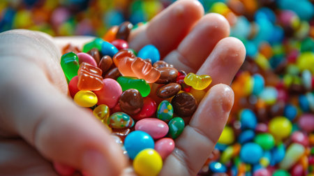 A close-up of a person's hand holding a handful of assorted candies, their fingers stained with sugary goodness