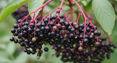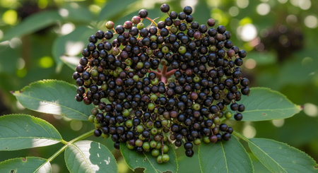 A close-up of ripe elderberry berries against a green background. By the way, elderberry is a symbol of nature's pharmacy, rich in antioxidants and vitamins.