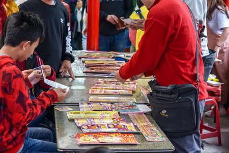 Taoyuan, Taiwan- January 25, 2020: Lottery ticket sold outside the temple