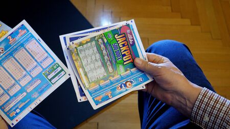 Lake Elsinore, California - May 20, 2021: Mans hand holding a variety of lottery tickets.