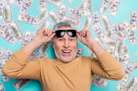 Above view portrait of astonished person hands touch glasses look camera isolated on teal color background