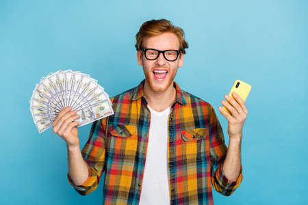 Photo of excited satisfied positive guy with red hair dressed plaid shirt win on bets lots of money isolated on blue color background