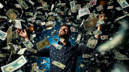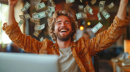 Excited man celebrating a victory while surrounded by flying cash.