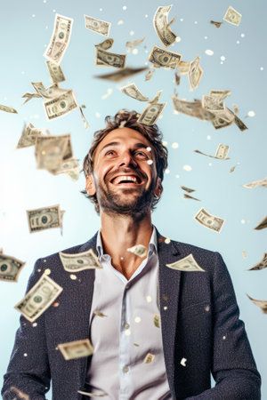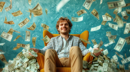 Young businessman surrounded by floating dollar bills, symbolizing wealth, success, and financial prosperity in the corporate and entrepreneurial world.