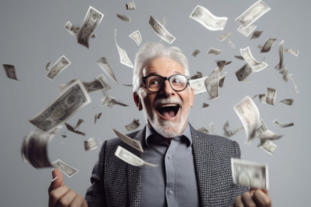 Man in suit and tie with money falling from the sky behind him. Generative AI.