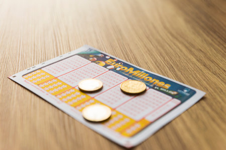 Paris, France - Circa 2019: Senior man preparing to play EuroMillions and Lotto lottery game with multiple tickets - POV happy men looking at the numbers with Jackpot 500000 Euros