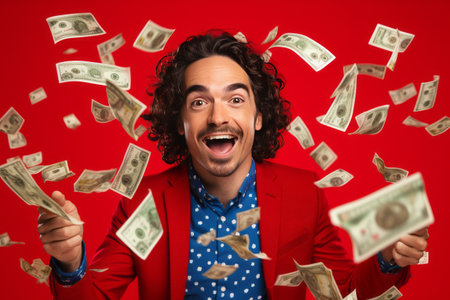 Photo of wealthy rejoicing overjoyed, man standing in rain of dollar banknotes while isolated with red background