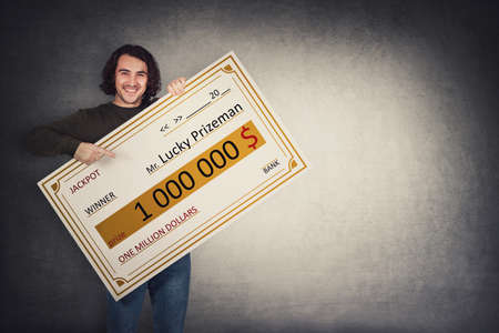 Excited man holding a lottery winner bank check. Happy jackpot guy winning one million dollars prize. Big banner announcing the main award. Wealth, luck and success concept. Becoming a millionaire