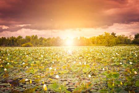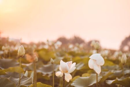 Beautiful white lotus on lotus lake at sunset. Concept of calm, harmony and peace