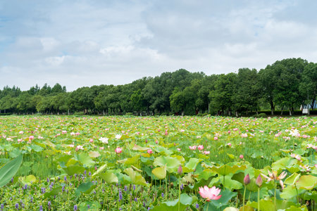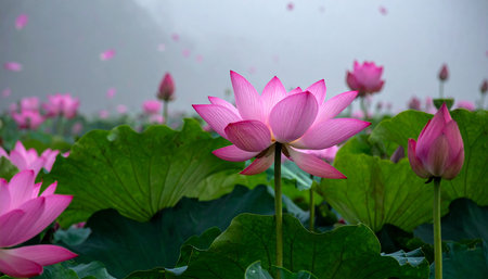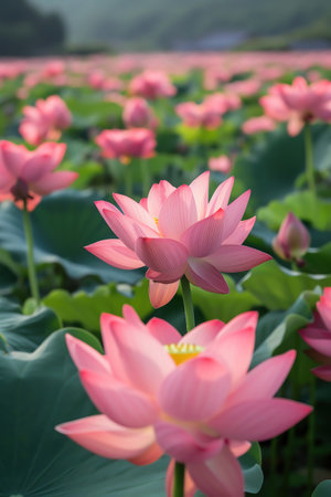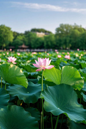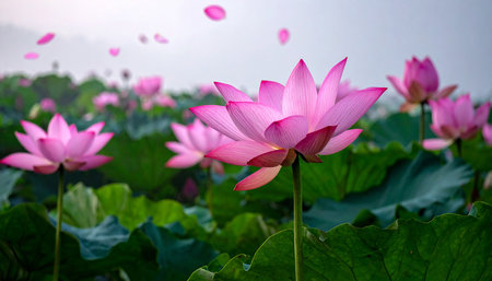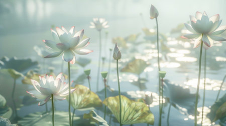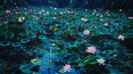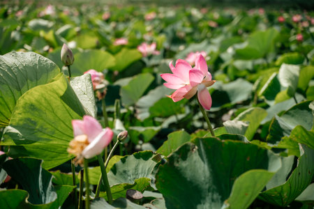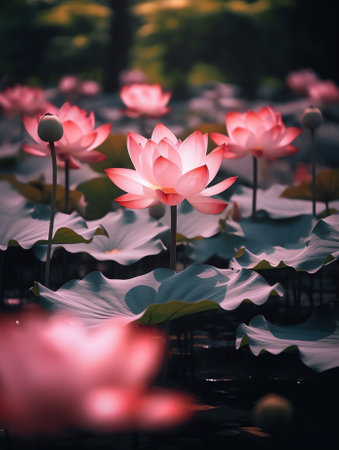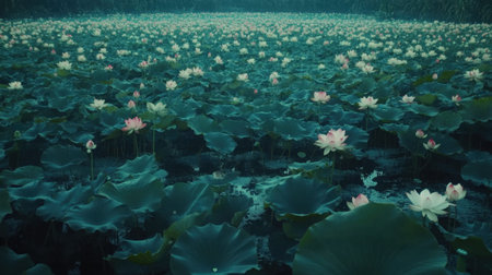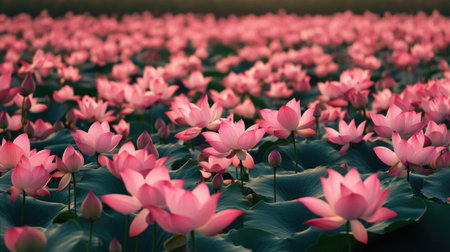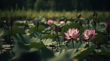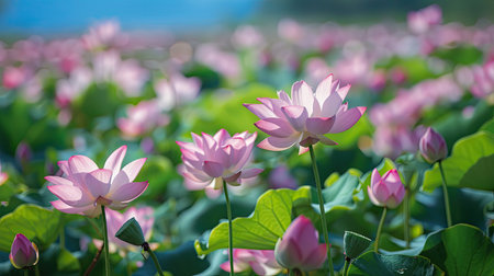 This enchanting image showcases a lotus pond filled with vibrant flowers amid lush greenery. The soft natural light enhances the tranquil atmosphere, perfect for relaxation or inspiration.
