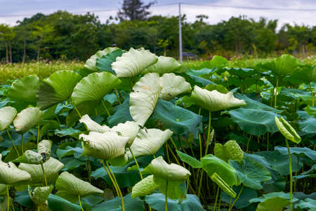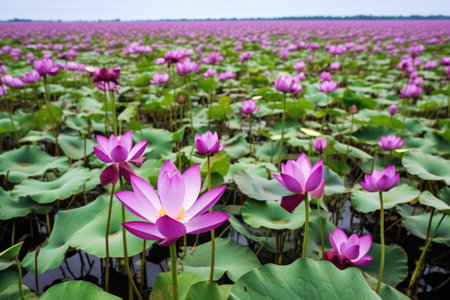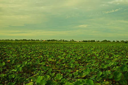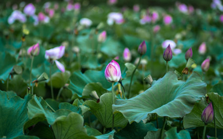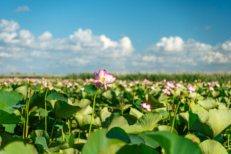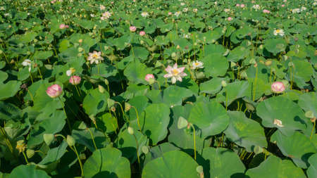 Field of Royal lotus (Nelumbo Nucifera) floating on water in a marsh