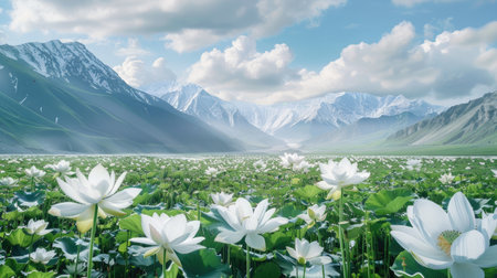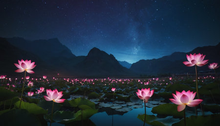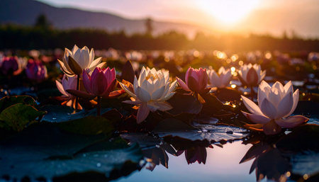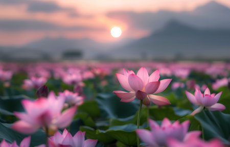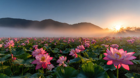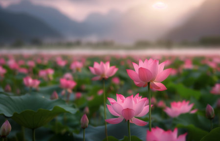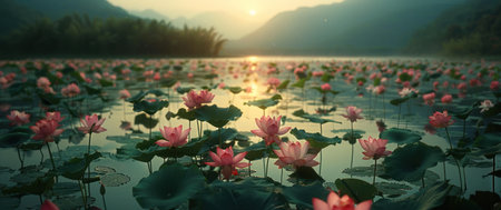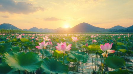 Beautiful scene of lotus flowers blooming at sunset, surrounded by greenery and mountains, creating a peaceful natural landscape for relaxation and reflection.