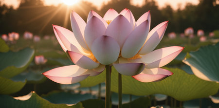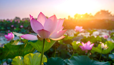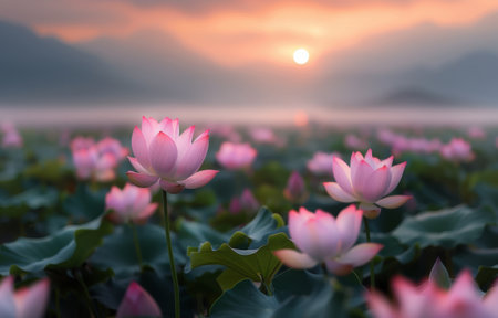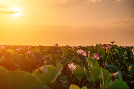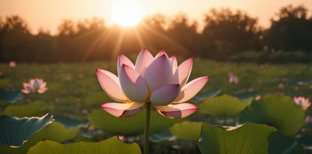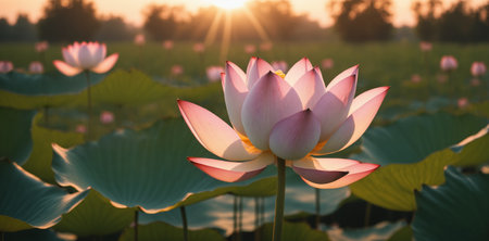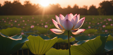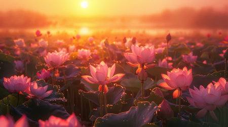 Sunrise over the horizon, casting a golden glow on a field of lotus flowers, creating a breathtaking scene