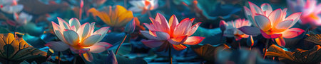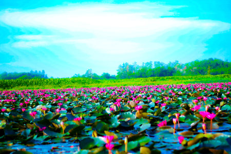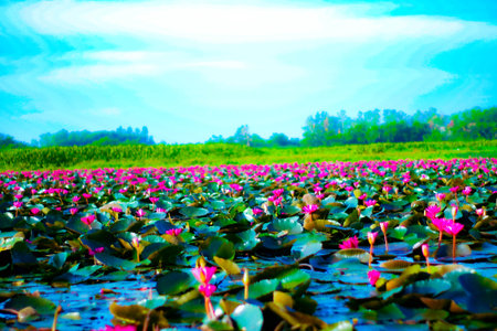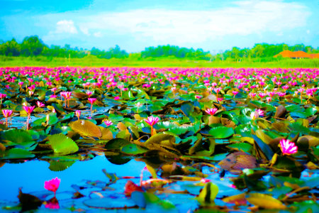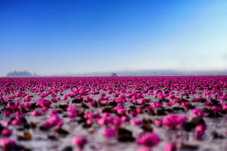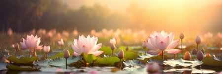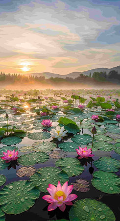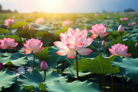 AI Generated. Serene Lotus Pond at Udon Thani Dawn A Colorful Floral Symphony in the Morning Light