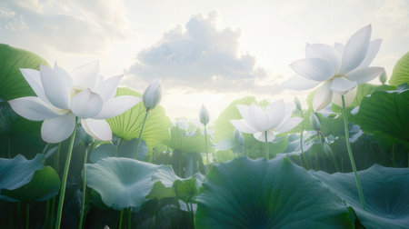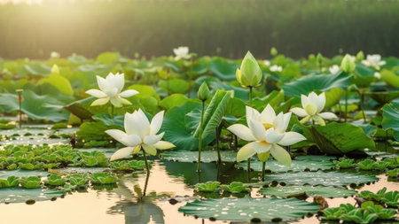 This image showcases white lotus flowers in full bloom, surrounded by vibrant green lily pads on a tranquil pond. The composition is lit by soft, diffused light, suggesting either sunrise or sunset. This serene scene could be used in various commercial or editorial contexts, offering a sense of peace and natural beauty.