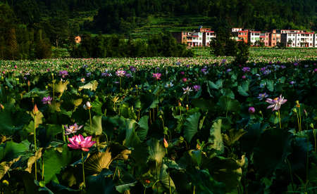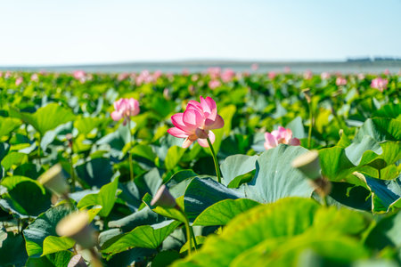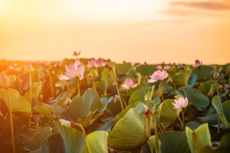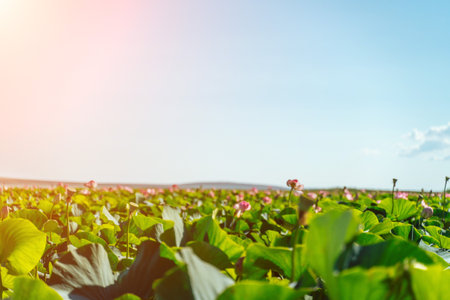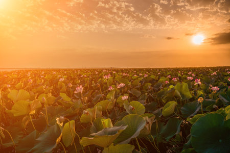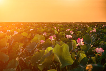 Sunrise in the field of lotuses, Pink lotus Nelumbo nucifera swa