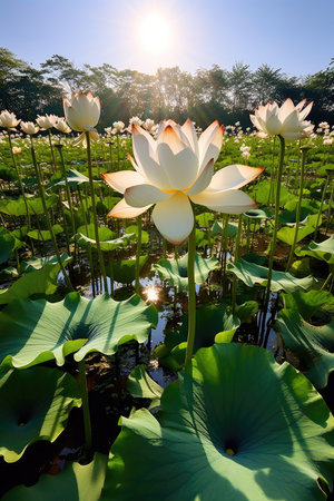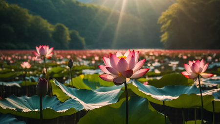 Nature. lotus lake with sunshine, AI Generated.