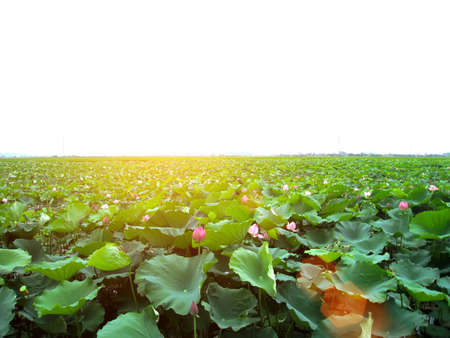 Lotus flower blooming in the pond with green leaves and sunlight