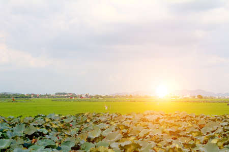 green rice, lotus pond, field and sky