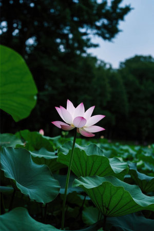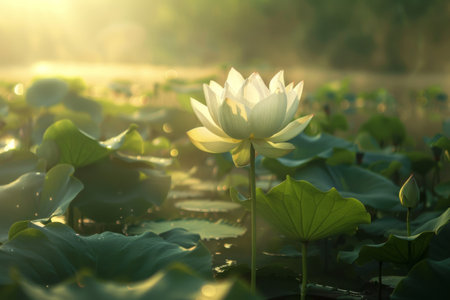 A graceful lotus flower rises above the tranquil waters of a serene pond, illuminated by the soft morning light. The surrounding lily pads create a peaceful atmosphere, enhancing the beauty of dawn.