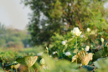 White lotus flower blooming on the pond in the morning.