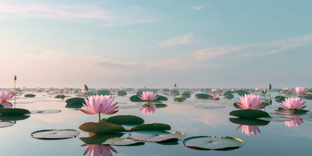 A serene pond surrounded by blooming lotus flowers and a pastel sky.