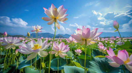 A field of blooming lotus flowers under a clear blue sky.
