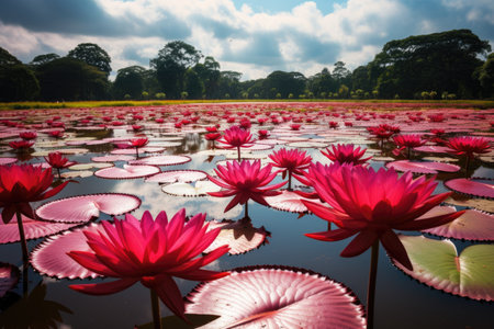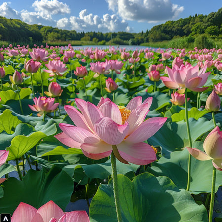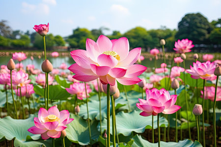 A stunning view of a lotus flower pond showcasing vibrant blooms amidst lush green leaves, creating a serene and peaceful natural setting.