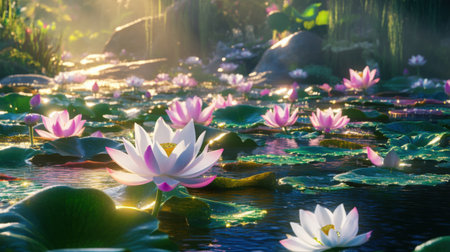 A serene scene of a pond filled with blooming lotus flowers and large green lily pads. The flowers are in various stages of bloom, with delicate pink, white, and purple petals. The lush green foliage and the soft sunlight create a tranquil and beautiful natural setting.