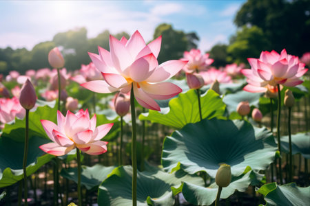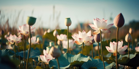 Generative AI : lotus flowers on the pond close up
