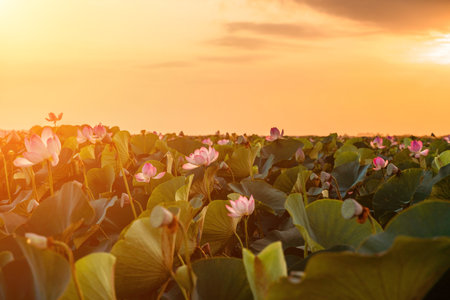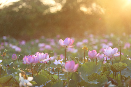 Beautiful pink lotus flowers blooming in the lake at sunset