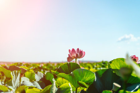 Sunrise in the field of lotuses, Pink lotus Nelumbo nucifera sways in the wind. Against the background of their green leaves. Lotus field on the lake in natural environment.