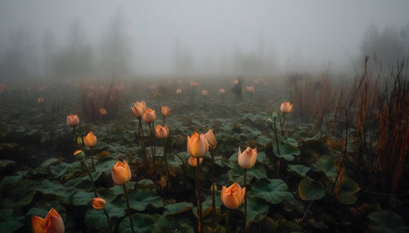 Lotus blossoms in a foggy field.
