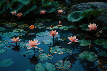 AI Generated. Peaceful Pink Water Lilies Lily Pads Pond Calm Water Surface