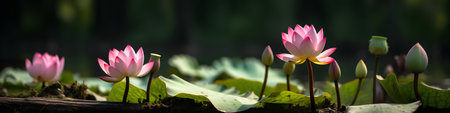 Lotus flowers banner on blurred background with copy space, nature concept for design